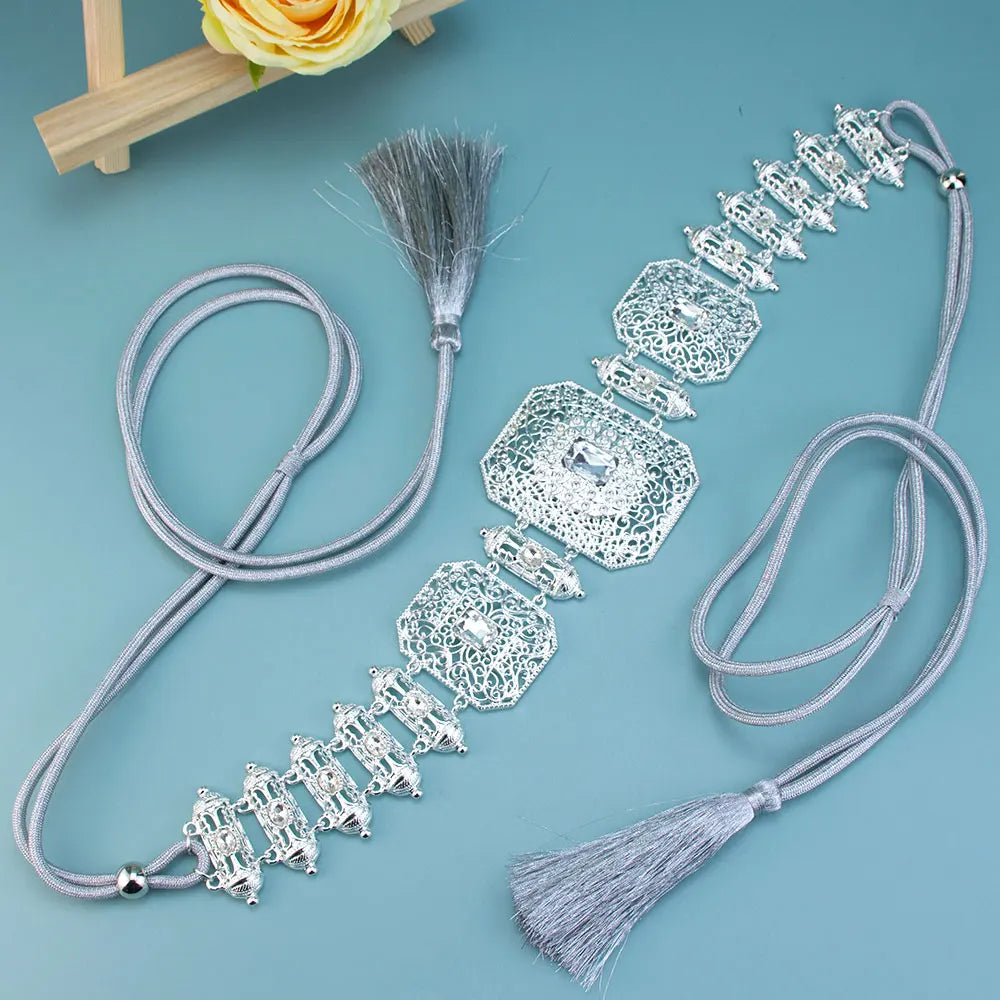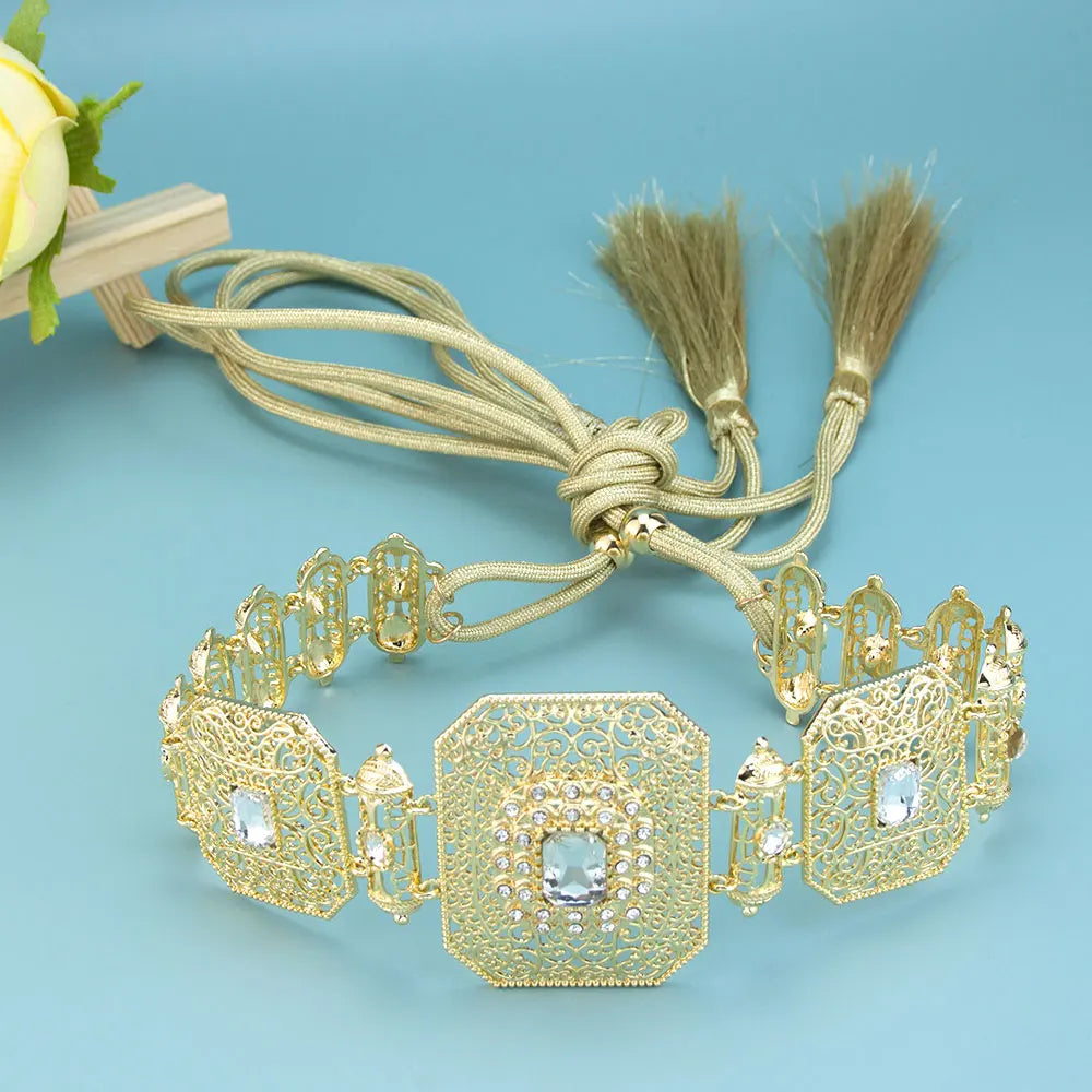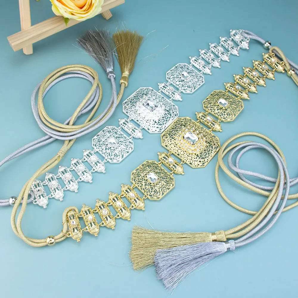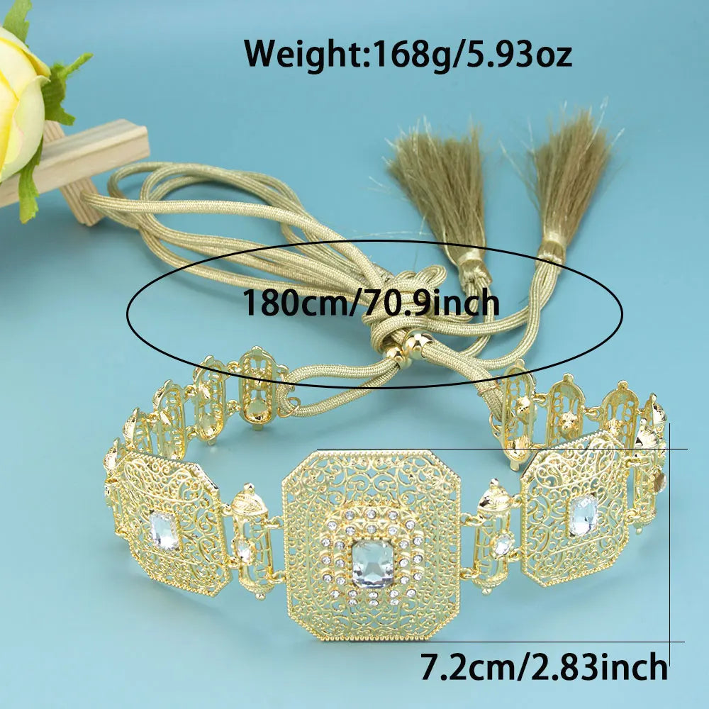 Les cristaux et le métal doré symbolisent la richesse, la lumière et la sophistication, tandis que les pompons apportent légèreté, mouvement et joie. Le motif géométrique et arabe reflète l’harmonie, l’équilibre et l’histoire culturelle, rendant la ceinture à la fois esthétique et significative. Porter cette ceinture permet de se sentir connectée à un héritage culturel tout en affirmant son style personnel et sa féminité. Elle devient ainsi un symbole de raffinement, de glamour et de confiance en soi, capable de rehausser n’importe quelle tenue avec élégance.