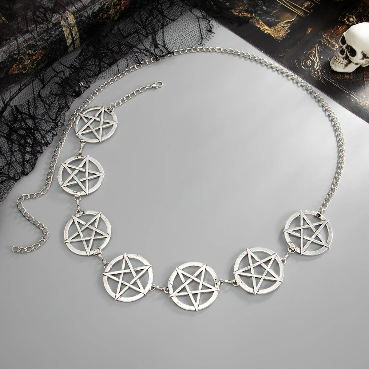 Cette chaîne se distingue par son style neo-gothique audacieux et moderne. Le pentagramme ajouré est le point central du design, symbolisant à la fois mystère, équilibre et créativité. Le motif circulaire ajoute de la fluidité et de la symétrie à la pièce, tandis que l’agencement des maillons et des éléments décoratifs renforce l’aspect artistique et tendance de l’accessoire. Le design allie influences punk, boho, vintage et moderne pour créer un bijou polyvalent et visuellement saisissant, adapté à diverses occasions et styles vestimentaires.