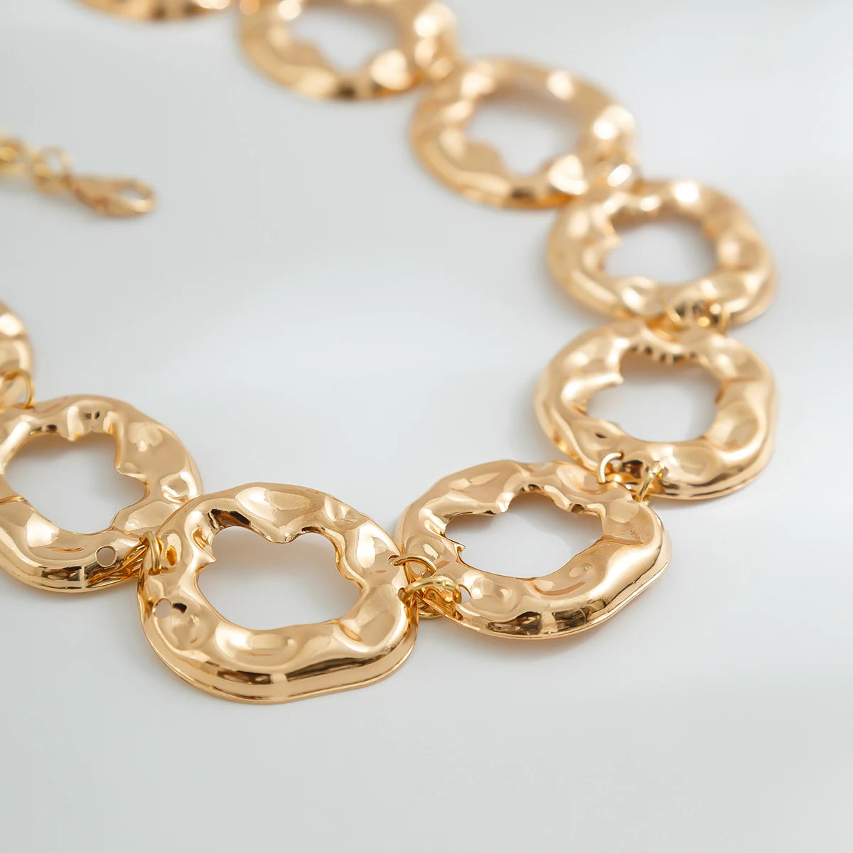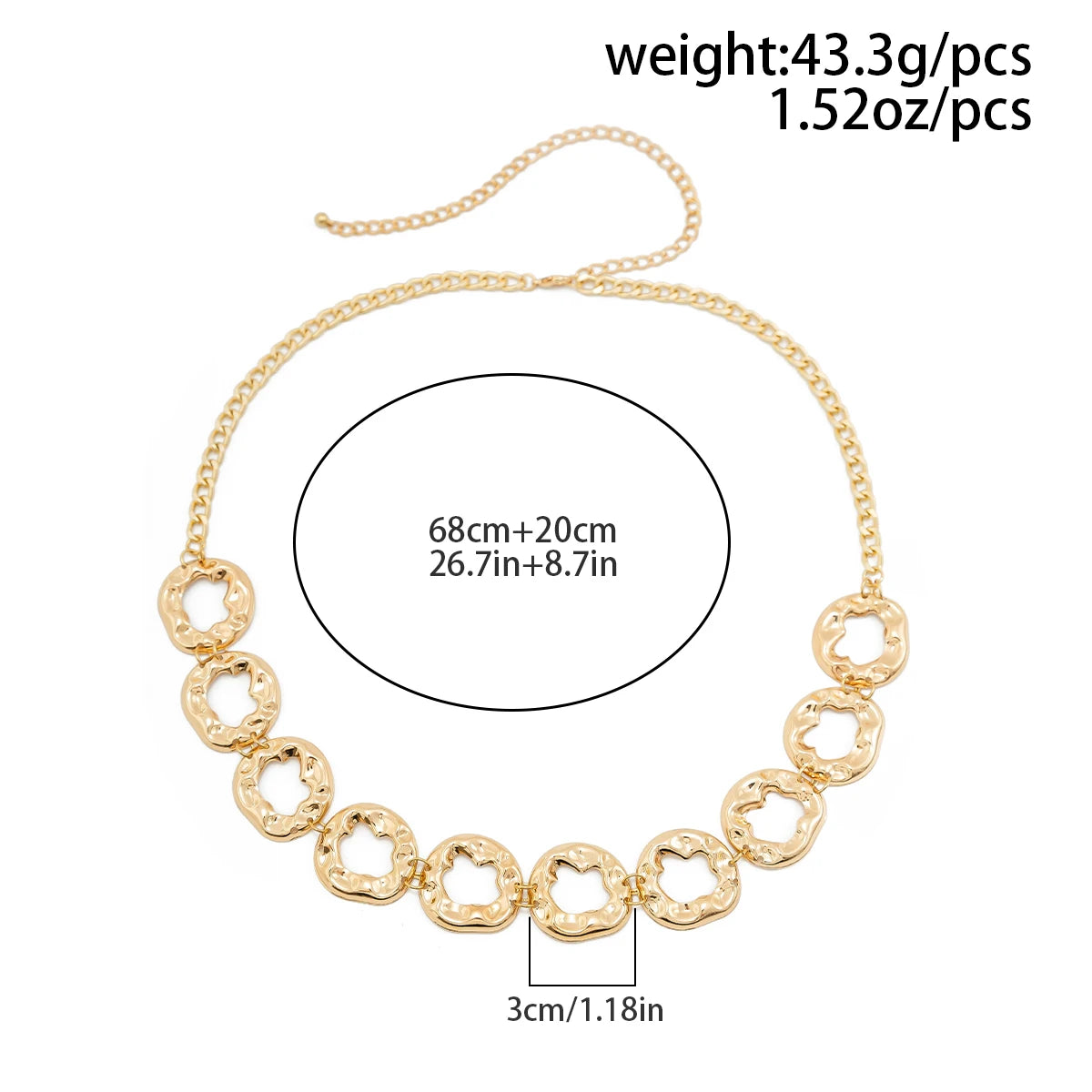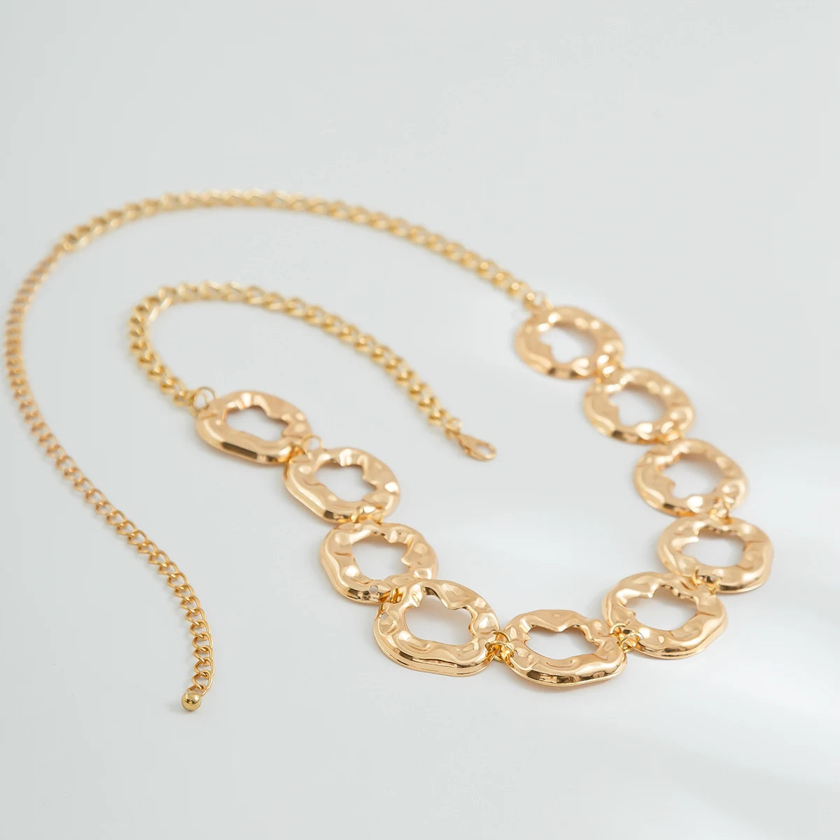 Les cercles irréguliers de cette chaîne symbolisent l’équilibre, la continuité et la fluidité, représentant l’harmonie dans la diversité et l’originalité. La finition dorée évoque la richesse, le luxe et la sophistication. Porter cette chaîne permet de mettre en valeur la silhouette tout en exprimant un sens du style audacieux et moderne. Elle devient non seulement un accessoire de mode, mais également un symbole de confiance en soi, de féminité et de créativité.