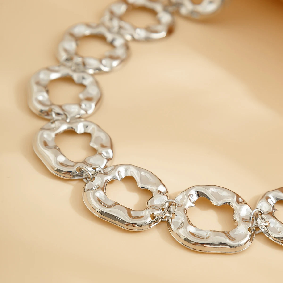 Le design irrégulier des cercles crée un effet asymétrique et dynamique qui attire le regard. Chaque cercle se connecte harmonieusement aux autres, créant un mouvement visuel fluide et élégant. Cette asymétrie moderne s’adapte parfaitement aux tendances actuelles de la mode et permet à la chaîne de se démarquer comme un accessoire audacieux et unique. Le motif circulaire est à la fois classique et contemporain, permettant de combiner le style intemporel des formes rondes avec une esthétique moderne et originale.